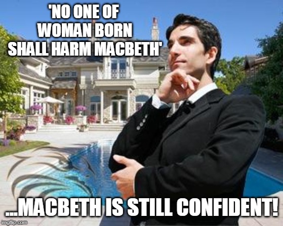 Macbeth in this scene abandons the security of the castle and challenges all soldiers on the battlefield. He is aware that he has no escape but he is still confident. The Weird Sister’s second prediction: ‘non of woman born shall harm Macbeth’ lead him to an over-confidence that will soon result in his downfall. After the young Siward is killed by Macbeth, Macduff appears to get his revenge. Macbeth’s over-confidence is leading him to his downfall.