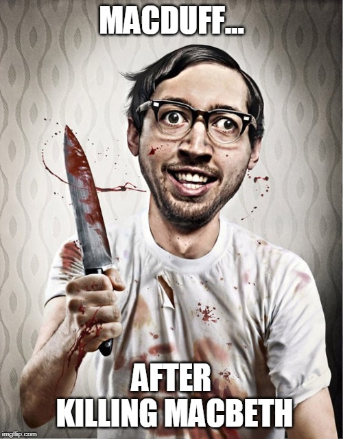 Malcom tests Maduff’s loyalty by telling Macduff that he wouldn’t be a good king and he’d betray his own country. Macduff clear his throat by telling him that he couldn’t stand for this, he doesn’t want to be a king and always supports him and his country. Macduff than hears the news from Ross that Macbeth has murdered his family. Malcom encourages Macduff to convert his grief to anger and to get revenge. The major theme is violence and revenge.